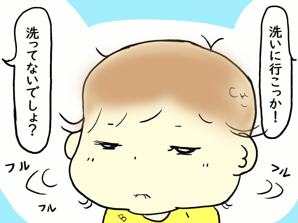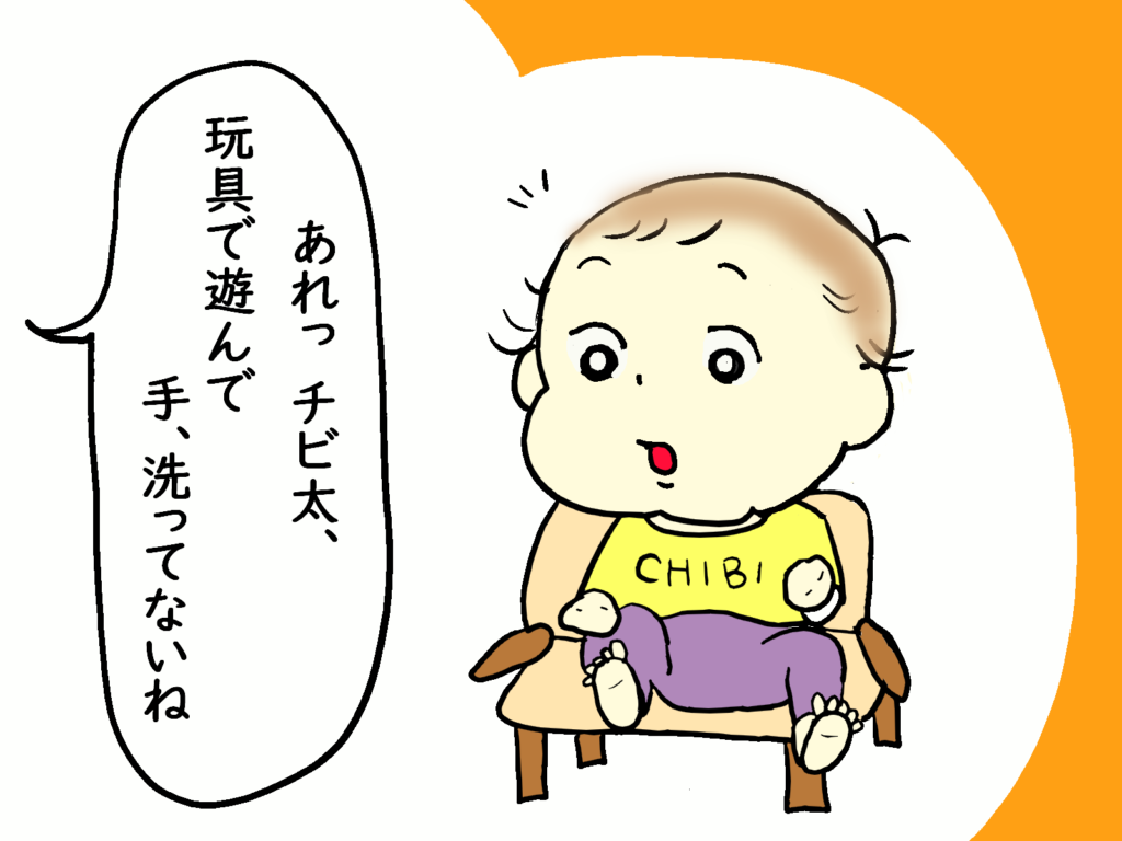 ふた江の旦那君がご飯を食べさせようとした時、もう手を洗ったと、1人で洗いに行ったと頷く孫のチビ太ん。